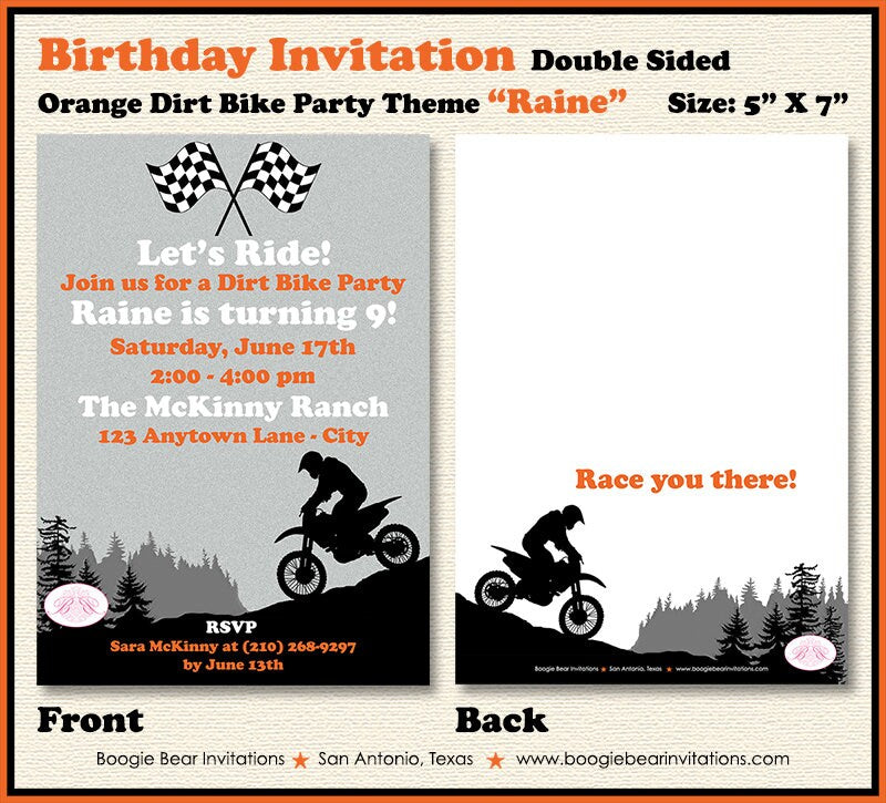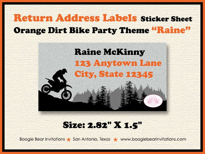 Race you there! This awesome party invitation features your personal party information for a cool orange dirt bike party. The matching return address labels are great for coordinating your fun party theme. (see photo 3)