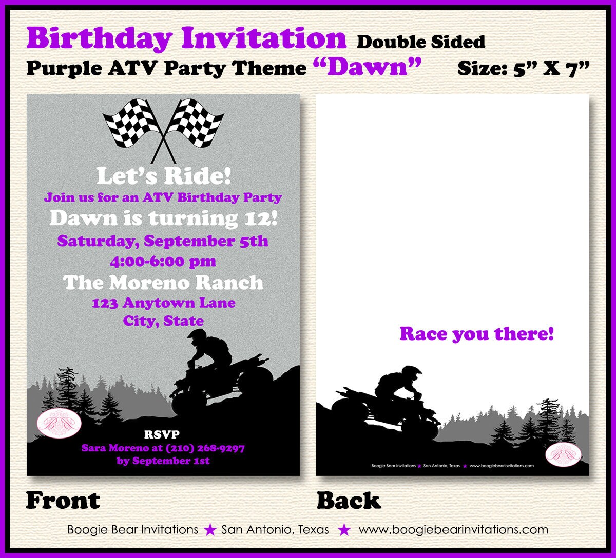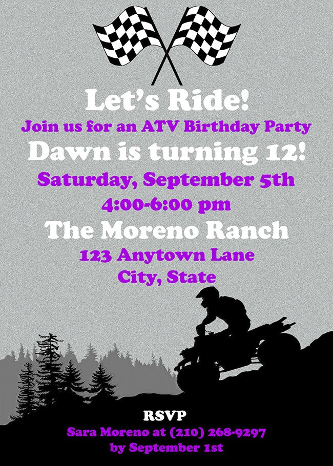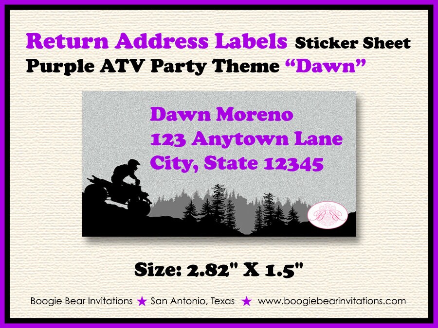 Race you there! This awesome party invitation features your personal party text for a cool purple ATV party. The matching return address labels are great for coordinating your fun party theme. (see photo 3)